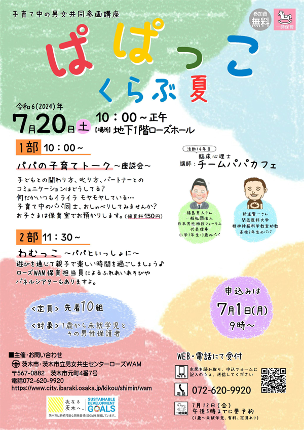 | 申込み | 2024年7月1日(月)9:00~ 7月19日(金) 参加については、茨木市のホームページ(詳細ページが開きます)をご覧いただき、電話、HPのメールフォームよりお申し込み願います。 |