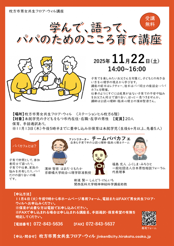 子育てを楽しみたい男性を対象に、講座の前半は子どもとの向き合い方を心理学の視点から学びます。後半は、参加者同士で座談会・パパカフェを開催します。