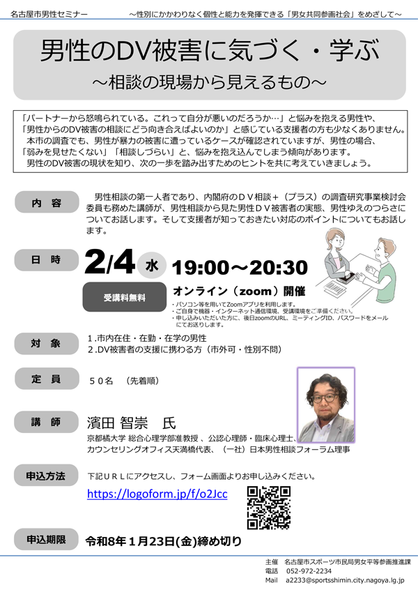 | 講 師 | 濱田智崇氏 京都橘大学総合心理学部准教授、公認心理師・臨床心理士、カウンセリングオフィス天満橋代表、(一社)日本男性相談フォーラム理事 |